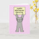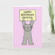 A grey cartoon cat holding up a pastel lemon coloured sign that says 'Happy Birthday Crystal'. The image has a pastel mauve coloured background.