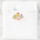 This peel and stick gift tag has a white background along with multicolored cupcakes and a happy birthday written on them.