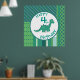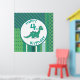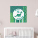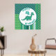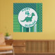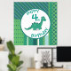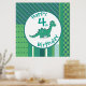 Happy smiling dinosaur in green/blue patterns background. Happy birthday dino wall art, poster.