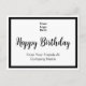 You can add your logo to the front of this postcard. The logo will be above a script that says Happy Birthday. Two lines of display text are below the script for your personalized message. The postcard has a black border.