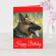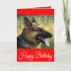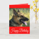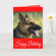 This Cute Happy Birthday card features a portrait of a German Shepherd dog sitting in a meadow on an early summer morning.