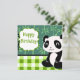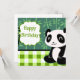 An adorable design of a cute, cartoon, black and white, little panda. In the design, it says "happy Birthday" in green text. The background is green, with light green coloured bamboo, and a bright green gingham pattern. Very cutesy and colourful. Great for anyone looking for cute panda designs that say "happy birthday," on it.