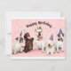 A joyful scene of five playful dogs wearing colourful party hats, surrounded by confetti.