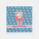 This adorable design is great for a child's birthday. It features a female bull in a pink sweater, holding a hot chocolate, with peppermint sticks. The background is blue with a light blue heart pattern. The text can be customized.