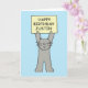 A grey cat holding up a lemon coloured sign that says 'Happy Birthday Justin'.