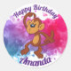 This sticker can be customized and is super cute! It has a cartoon monkey in the centre and a pink, purple, and blue background.