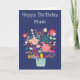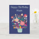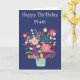 A colourful birthday card featuring a vase of bright flowers. Dark blue background. The wording at the top of the card says "Happy Birthday Mum". Blank inside for your own message. Size 5" x 7".