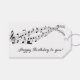 Musical notes on music staff with treble clef and Happy Birthday text.