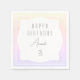 Paper napkins with a birthday theme, in pastel shades of yellow, pink, purple and blue.