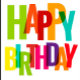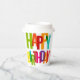 A colourful paper cup adorned with vibrant letters spelling 'Happy Birthday' in various hues. The cup is set against a clean, light marble background, emphasizing its festive design. The bold typography creates a playful and cheerful atmosphere.