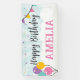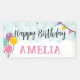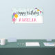 A bright and fun banner for a birthday party that is customizable for the birthday party person's name. It has a blue starburst background bordered with balloons and stars on clouds, with a party flag in the corner. In feminine colours of purple, yellow, pink and green.