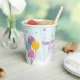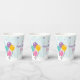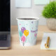 A fun birthday cup with the background of a blue starburst, clouds, stars and balloons. Customizable with the birthday party person's name and the bright colours will be sure to pep up any party.