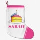 Stocking features an original marker illustration of a slice of delicious birthday cake with pink frosting and a candle on top. Simply personalize with your name for a one-of-a-kind party decoration!