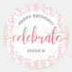 “Happy birthday”. Here’s an unique addition to your birthday fête! “Celebrate” with this bold, stunning, modern sticker for an event to remember. Sparkly, dusty, pink rose gold glitter handwritten calligraphy script and dots plus light grey typography overlay a dusty pink and white striped background. Personalize the custom text with your guest of honour’s name. Choose from a round or square shape. Guaranteed to add stylish fun to her special party! Matching and coordinating invitations, napkins and other birthday goodies are also available in this trendy and special collection.