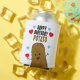 Fun happy brown potato surrounded by red and blue love hearts with Happy Birthday Potato in black and brown lettering above his head.
