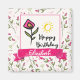 A personalized Happy Birthday magnet with a square frame with a pink border which says "Happy Birthday" written in a trendy font with a yellow sun above and a pretty pink flower. A pink ribbon with a personalized name or other text below. The backdrop is a seamless pattern with hand drawn pink wildflowers with long green stems and leaves on a eggshell white coloured background. Pink circles and sprigs also decorate the design. Cute and summery design.