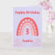 Cute Birthday Boho Rainbow card with age and name and a verse inside, can be personalized by clicking on the 'personalize this template' button. Cute card in Red and pinks on a pale lilac background. Pretty hearts and stars in the rainbow and scattered around the name.