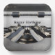Extreme close-up of an old-fashioned typewriter with "happy birthday" text in smudged type font.