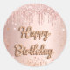 A sticker for a girly and glamourous birthday party. A faux rose gold metallic looking background with an elegant faux rose gold and pink glitter drips, paint drip look. The text: Happy Birthday is written with a golden balloon style font.