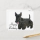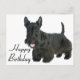 This charming Happy Birthday greeting postcard features a black Scottish Terrier dog highlighted against a crisp white background.