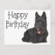 This charming Happy Birthday greeting postcard features a black Scottish Terrier dog highlighted against a crisp white background.