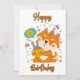 This invitation display the words "Happy Birthday" in a unique print font with orange letters black outline with a Shiba Inu dog holding a cupcake with party decals and streamers throughout the background in this birthday theme and style. Printed on a classic, all around paper 17.5 pt thickness with an uncoated matte finish with an eggshell texture made and printed in the USA with "It's A Party" printed on the back.