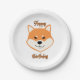 These plates display the words "Happy Birthday" in a unique print font with orange letters black outline with a Shiba Inu dog face in the centre in this birthday theme and style. Plates come in a set of eight and is printed on durable paper stock great for serving cake, appetizers, or salads. All plates are FDA approved for food contact and safety fully biodegradable and printed with vegetable-based inks printed in USA.