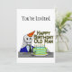 A funny birthday design featuring a skeleton man with party hat and spider webs strung all over, sitting in front of his birthday cake. Happy birthday old man!