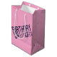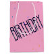 Contemporary black and white Happy Birthday text on pink with party confetti.