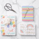 A stylish set of birthday gift wrap with a magical rainbow theme. The first sheet features a cute unicorn surrounded by balloons, hearts and shooting stars. This design is personalized with a birthday age and name. The second sheet has pretty rainbow stripes. The third sheet has a custom name and is illustrated with a rainbow, love heart and stylish script lettering. Each sheet has a matching colour palette of peach, pink, yellow, blue-green, lavender-blue and gold.