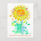 A cute happy birthday postcard decorated with an animal flower featuring a lion with layers of petals painted in bright shades of yellow and orange with leaves and stem painted in several shades of green watercolor.