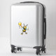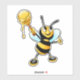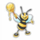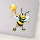 A vinyl decal with a happy black and yellow cartoon honey bee, standing up on his hind legs wearinh little shoes. Standing with a scoop of honey dripping down from a honey stick. His arms raised up in the air and a big smile on his face, thrilled to have so much honey.