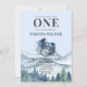 A rustic watercolor happy camper 1st birthday party invitation, featuring mountains, forest woodlands, little campers shoes, birthday party invitation. A perfect invite for a camping birthday party with outdoor activities.