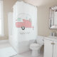 This shower curtain features an original illustration by Charming Ink of a pink retro camper, also known as a caravan. The script font proclaims — happy camper. Change the message or personalize with names.