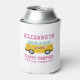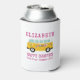 A colourful can cooler makes a great gift or keepsake from your summer road trip. The can cooler features an illustration of a retro RV camper with your name , Happy Camper and Road Trip Summer 2020 . All text is in a simple hot pink typography iand is easily personalized.