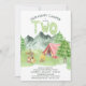 Happy Camper 2nd birthday invitation - perfect for an outdoor birthday party, backyard bbq, campers, picnic in the park etc. This watercolor design has mountain and woodland scenery with tent, campfire, guitar and lantern. TWO is hand lettered in adventurous typography with green watercolor, and the title reads "our happy camper is turning two", which you can customize.
