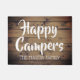 Fun, rustic wood outdoor decor gift for retired couples, hikers, rvers, campers, and nature lovers- Personalized, barn wood look doormat reads 'Happy Campers' in bold, handwritten look lettering and text template below for adding family name (or any custom text) below in white, elegant lettering. Against a background of rustic, old wood boards. Great retirement gift, too. Would look perfect in front of an RV or cozy log cabin to welcome guests.