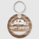 A simple yet stylish keychain with the phrase 'Happy Campers'. Customize with your family name. Shown with a rustic wood slat background, perfect for holding your camper or motorhome keys.