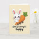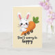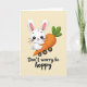 This card shows a pale yellow background with a stylized white rabbit centred in the scene, its round face turned forward with big black eyes, a tiny red nose, and pink-lined ears. The rabbit hugs an oversized orange carrot like a close friend, its arms wrapped in a snug hold that reads as affectionate and a little flirty 🐰. The carrot is drawn as a quirky little ride with four dark circular wheels, giving the scene a gentle sense of motion. Soft shading and mild gradients add depth around the rabbit’s cheeks, the carrot’s curves, and the wheels, keeping the look smooth and cozy. A short pun-style phrase sits below the illustration in dark lettering, placed low and centred so the image stays the main focus. Warm cream tones mix with bright orange and a touch of green at the carrot top, with small shadows grounding the figures against the background 🌷. The rabbit’s pink ears tilt upward above the orange carrot, and the four wheels line up neatly beneath it in dark grey circles.