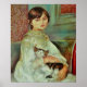 It is such a pretty picture. The cat is contented and happy. She looks like a little three coloured cat of brown, black and white. The girl wears a white dress with gold trim. Renoir is so good at it showing the character.