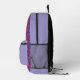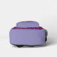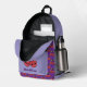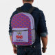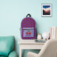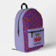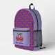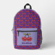The back of this fun backpack features a funny repeat pattern of adorable red cherries with green leaves and cute happy faces on a purple background. On the front pocket is the same cherries with a template below to add your name or other text.