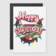 Happy Christmas cartoon logo with a robin, vintage text, Christmas lights and snow covered trees.