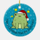 Happy Christmas green cartoon frog wearing a red Santa hat with a white fur trim and a white fluffy pompom. Behind him is a blue background with white sparkling snowflakes. Below the frog is a template in black type for you to add your own text to personalize this Christmas Ornament.
