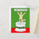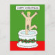 A cartoon man wearing only a bunch of mistletoe, jumping out of a giant cake saying 'Happy Christmas'.