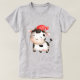 A t-shirt with an adorable image of a black and white spotted cow wearing a red hat.