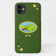 Happy crocodile & golden confetti on green forest iPhone 11 Case. Text can be personalized.