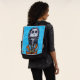 This Bold Face adult backpack with a interchangable front face has my original painting of a happy Day of the Dead lady skeleton in a colourful orange and blue striped cape holding a bouquet of white flowers on a patterned light and dark aqua blue background.
