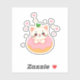 Kawaii cat sitting in a pink frosted doughnut with a small leaf, smiling with rosy cheeks, surrounded by stars and hearts.