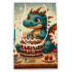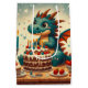A charming, teal-coloured dragon, with large, expressive eyes and a mischievous grin, takes centre stage in this delightful birthday scene. He sits proudly before a towering, decadent chocolate cake, adorned with colourful candles and fresh berries. The air sparkles with a festive atmosphere, accentuated by a backdrop of twinkling stars and scattered confetti. A plate of ripe strawberries sits nearby, promising a sweet treat after the main course. The dragon's playful posture and the warm, inviting ambiance create a heartwarming celebration of life and joy.