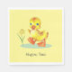 Happy duckling with flower on yellow Napkins. Text ready to be personalized.